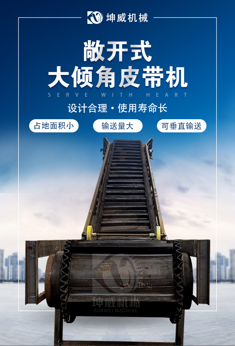 先說(shuō)一下大 傾角帶式輸送機(jī) 的優(yōu)勢(shì) (1)大傾角帶式輸送機(jī)的輸送傾角大,可達(dá)90,是大傾角輸送和垂直提升的理想設(shè)備。因此可以節(jié)約占地面積,節(jié)省設(shè)備投資和土建費(fèi)用,取得良好
